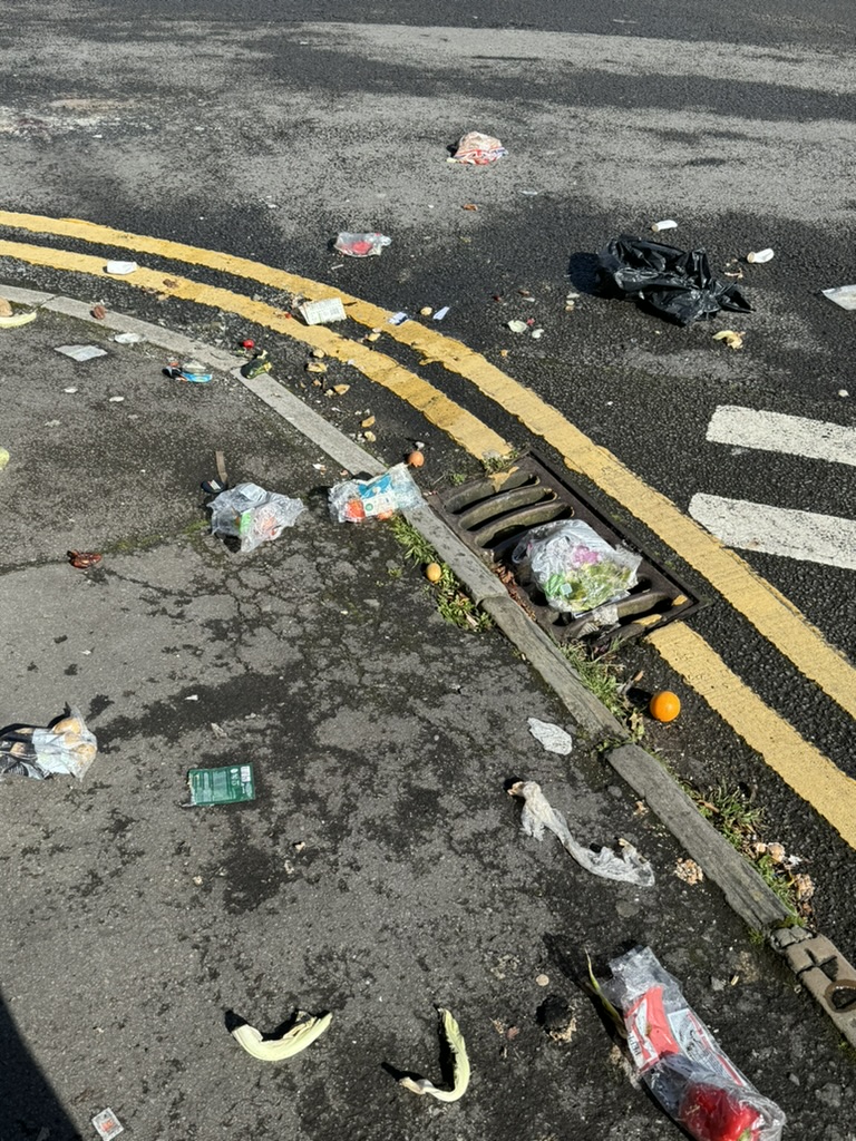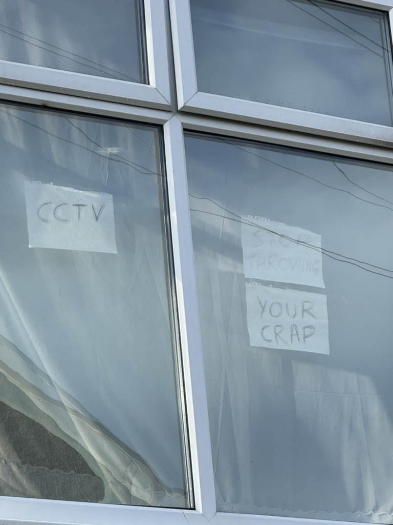The streets were tidier, and almost every house had a beautiful view of the sea. The further up I went, the more security cameras I saw, along with high gates and more expensive cars. (See Jan Kohler's report for more information about the safety narrative and its manifestations in Swansea). Here, it felt surprising when I encountered a house with a lot of trash bags in front. On the opposite side of that house, there was a colourful mural saying, “Let’s keep Mount Pleasant, pleasant.” It was carefully handcrafted, seemingly a community project. There were no city labels or anything that indicated that this was an appeal from the city administration to the residents. This was not the only mural I encountered throughout Mount Pleasant. There were more murals that looked the same on every other street I walked by. Several stickers on lampposts and notes on windows appealed to the community with the same message: Keep the trash and untidiness out of Mount Pleasant! It seemed like a redundant, moralising message.