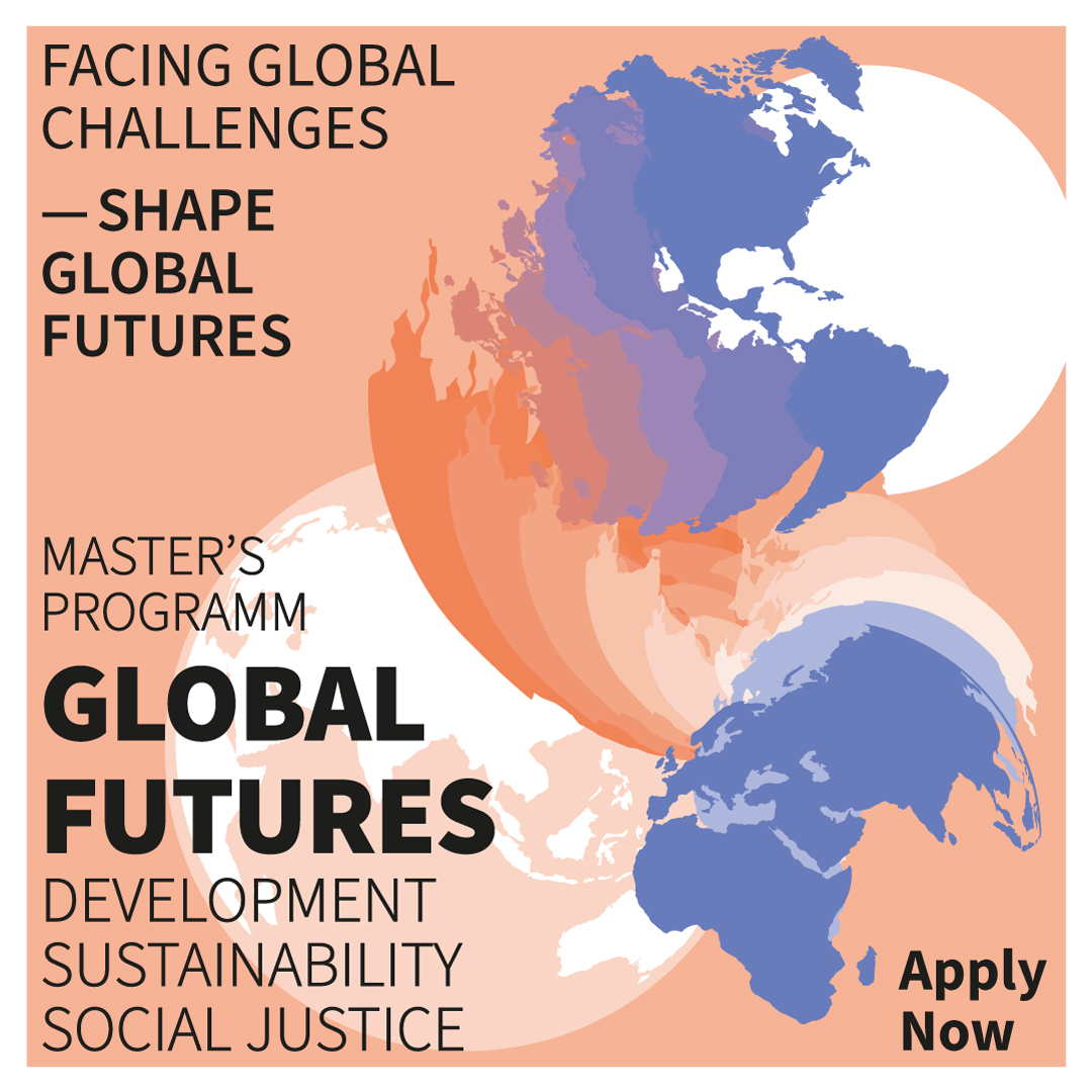 “Global Futures: Development, Sustainability, Social Justice” is an interdisciplinary master program that engages with the complexities and interdependencies of contemporary global challenges. Students learn how these global challenges impact local life worlds, examine the underlying drivers of inequality, conflict and ecological transformation, critically assess the effects of policy interventions, and discuss possible pathways toward more sustainable futures.