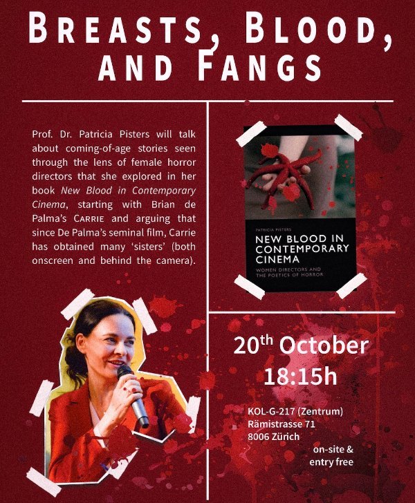 As part of Christine Lötscher's class on Coming of Age as Horror: Stephen King at ISEK - Populäre Kulturen, Patricia Pisters will start out with Brian de Palma's Carrie (1976) and talk about coming-of-age stories seen through the lens of female horror directors that she explored in her book New Blood in Contemporary Cinema. She will zoom in female authored horror stories that address the confusing experiences of coming of age as well as the anxieties and social traumas of ‹being a girl, alone, at night›, exemplified in films by Mary Hannon, Ana Lily Amirpour, Julia Durcournau, Emma Benestan and many others. In all case, human and nonhuman relations that a female authored poetics of horror puts on screen, opens up to a wide spectrum of emotions with its fangs in important bodily, phenomenological and socio-political issues for girls dealing with ‹growing pains›.